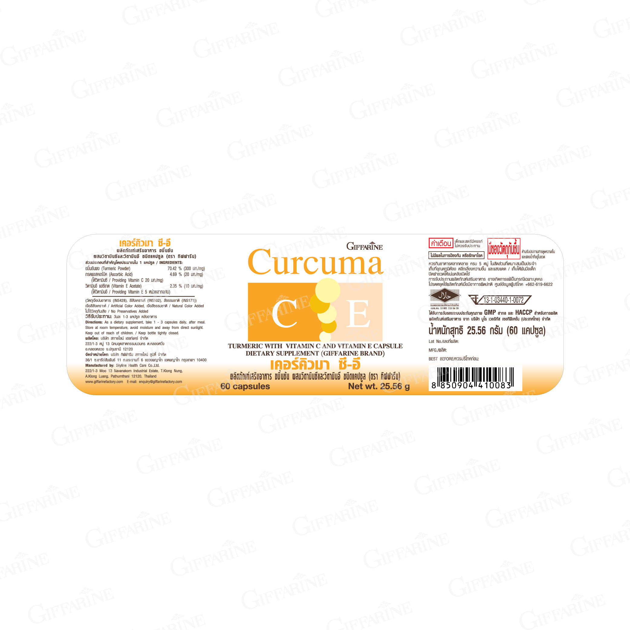 ส่วนประกอบที่สำคัญโดยประมาณใน 1 แคปซูล : ขมิ้นชันผง 300 มก. กรดแอสคอร์บิก 20 มก. (ให้วิตามินซี 20 มก.) วิตามินอี แอซีเทต 10 มก. (ให้วิตามินอี 5 หน่วยสากล)